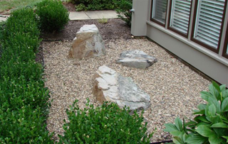 This picture is of a Zen garden for the real low maintenance person who has a place to put a garden that can’t be disturbed. If you have cats or dogs that run through the area, it wouldn’t be too great. Basically you dig out a base for crusher run gravel and place 3 boulders; one vertical for the sky, one horizontal for water, and one in between for earth. Then you edge the gravel with steel edging to hold the form. Voila, you are done. A few simple plantings in oriental style like Japanese maples, peonies, oriental evergreens and low acorus grasses can be used for accents..not a lot...just tucked in here or there.